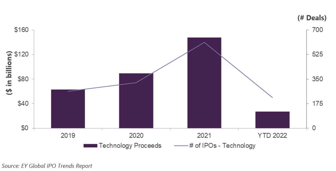 In 2022, IPO activity slowed down drastically, and many were postponed due to increasing market volatility precipitated by geopolitical tensions and macroeconomic factors. The average technology sector IPO size YTD is down from USD261 million to USD123 million YOY, although the sector continues to lead based on the number of IPOs.