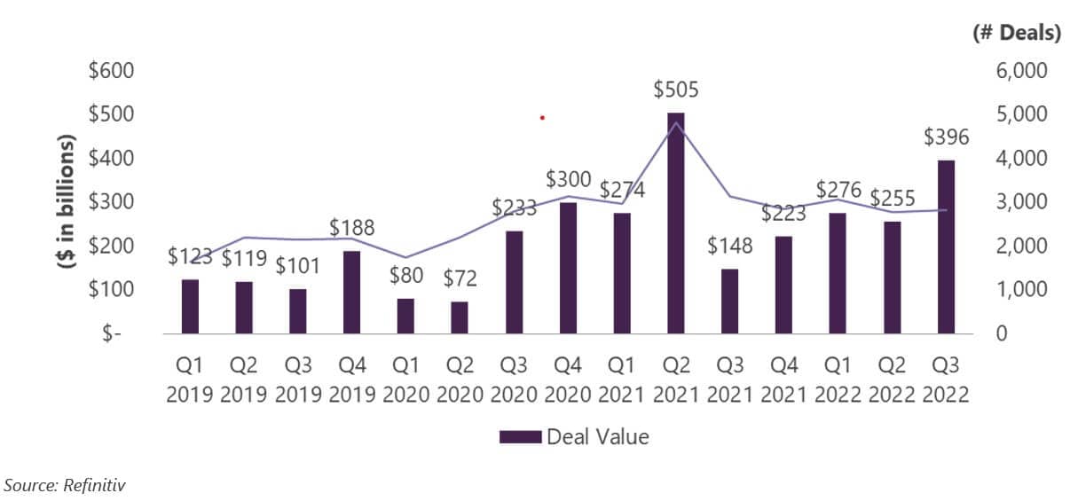 - The auto tech sector also registered all-time high M&A deals in Q3 2022, especially as vehicles are shifting to electric propulsion and becoming software centric. Brookfield Business Partners’ $8.2 billion acquisition of US-based automotive retail technology firm CDK Global was one of the largest deals of the quarter.