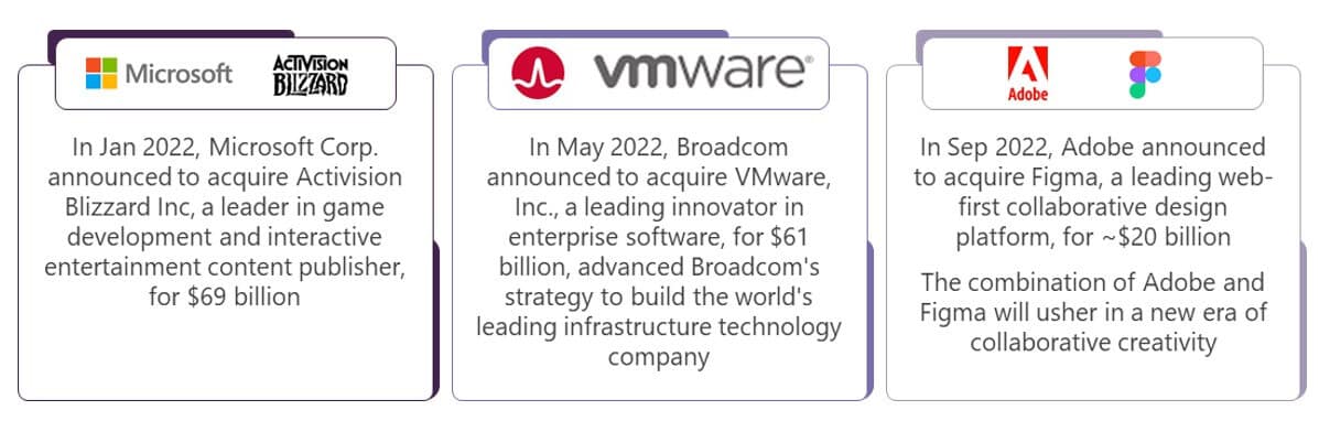 What lies ahead: Despite market fears surrounding falling valuations, geopolitical uncertainty, and rising interest rates, dealmaking within the global technology sector remained resilient so far in 2022. Mega deals tend to retain their value due to the strong strategic rationale behind the investment, whereas the mid-market deals have suffered to a large extent. With large amount of dry powder with PE firms, global buyout firms will be keen to look for more acquisitions. With these fundamentals driving activity, the tech M&A is likely to remain high going forward.
