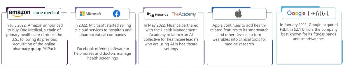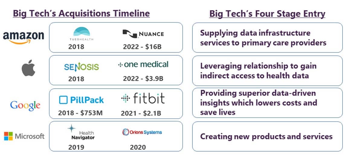 - Many big tech companies are entering healthcare through a four-stage process called ‘digital colonization.’ These companies act as connectors by building universal databases of health-focused artifacts. For example, in July, Amazon announced the acquisition of telehealth company One Medical for $3.9 billion.