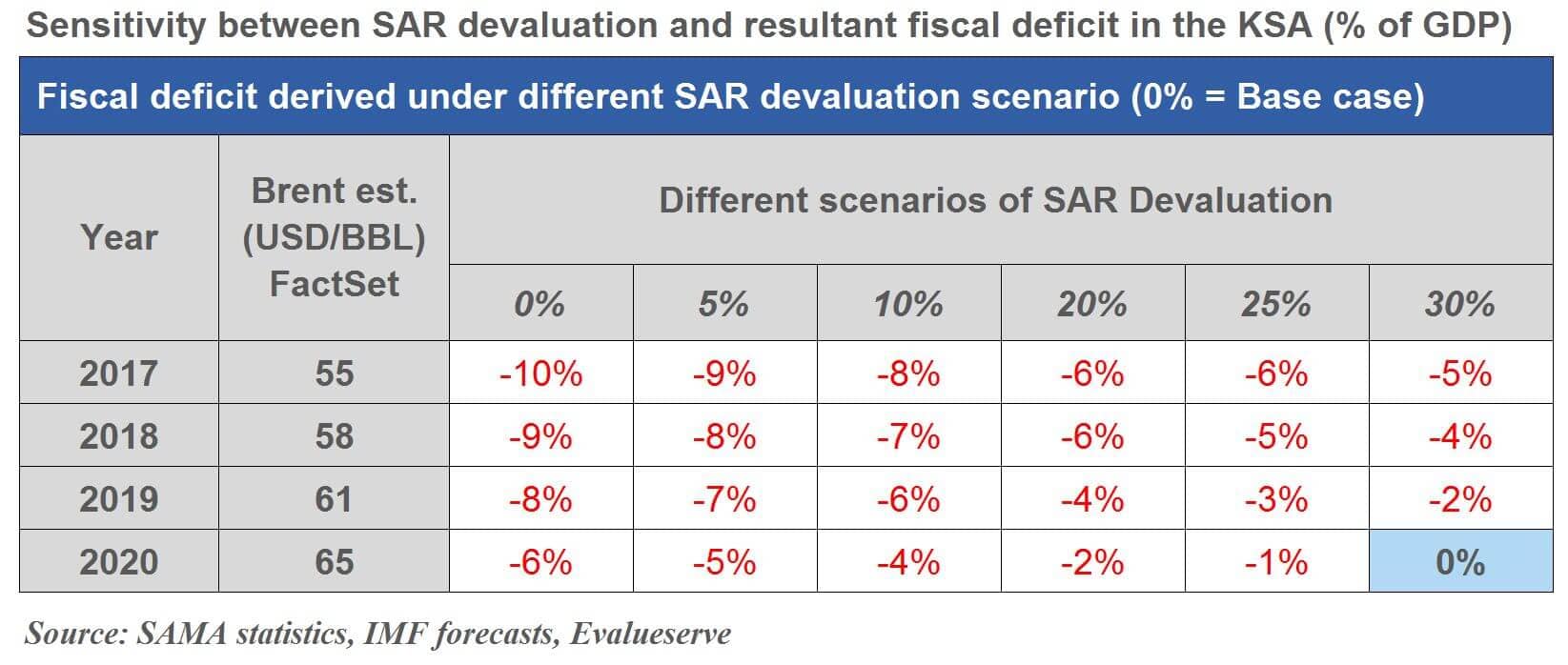 Our analysis shows that 30% SAR devaluation would effectively bridge KSA’s fiscal deficit