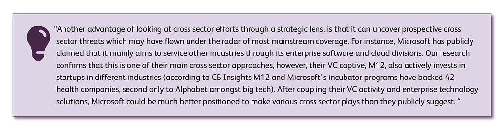 There isn’t necessarily a single cross sector approach that is most advantageous for tech companies. However, observing how large tech companies deploy these strategies can illuminate the strategic gaps and advantages tech companies face in new sectors, especially by looking at how these strategies complement each other.