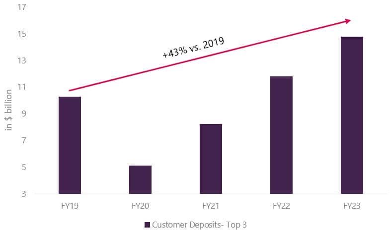Additionally, bookings continue to remain at an all-time high with higher prices than in FY23, driven by a record wave season. Booking channels, both direct and indirect, are exceeding expectations as companies broke prior records in the two weeks around Black Friday and Cyber Monday. Customer deposits (advances received against tickets) increased 25% YoY in FY23 and were up 43% compared with the peak registered in 2019.