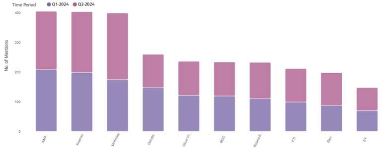 Platforms like Evalueserve’s Insightsfirst CI can amplify these efforts by providing real-time insights into D&I initiatives undertaken by leading consulting firms. The graph below, created on the platform, illustrates the top 10 companies with the highest frequency of posts on D&I initiatives during the first half of 2024, reflecting their strategic emphasis on enhancing D&I strategies and gaining public traction.