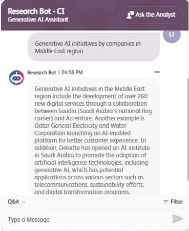 3. Enhancing Insightsfirst with GenAI Chatbot: To make Insightsfirst more intuitive and user-friendly, we have introduced a GenAI chatbot. Trained on proprietary datasets and leveraging large language models, the chatbot provides human-like, professional, concise, and relevant responses to specific inquiries. With this enhancement, Insightsfirst offers management consultants bespoke and actionable insights tailored to their requirements. For example, when asked on Generative AI initiatives in Middle East, the bot curates and provides human-like response including initiatives taken by companies like Accenture and Deloitte.