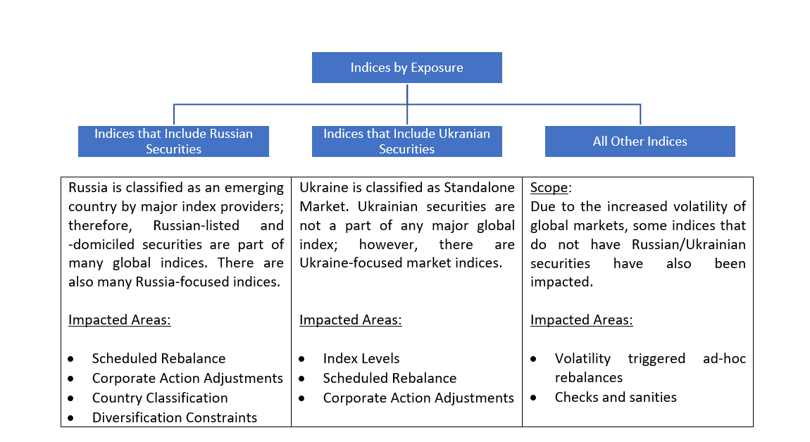 Russian stocks listed both in and outside of Russia as well as depository receipts (DR) listed globally have now become difficult to trade. The sanctions and following actions by stock exchanges such as the NYSE, Nasdaq and LSE have resulted in a trading suspension of Russian-domiciled stocks and listed Russian DR. Russia has banned the sale of securities by foreigners, so foreign market participants cannot access the Moscow Exchange (MOEX) freely. Russia also announced the closure of its stock market from February 28 to March 9, 2022. The stock market in Ukraine has also halted trading operations. Hence, the Ukraine market has also become inaccessible. The index management teams are monitoring these scenarios and evaluating various options to manage their indices.
