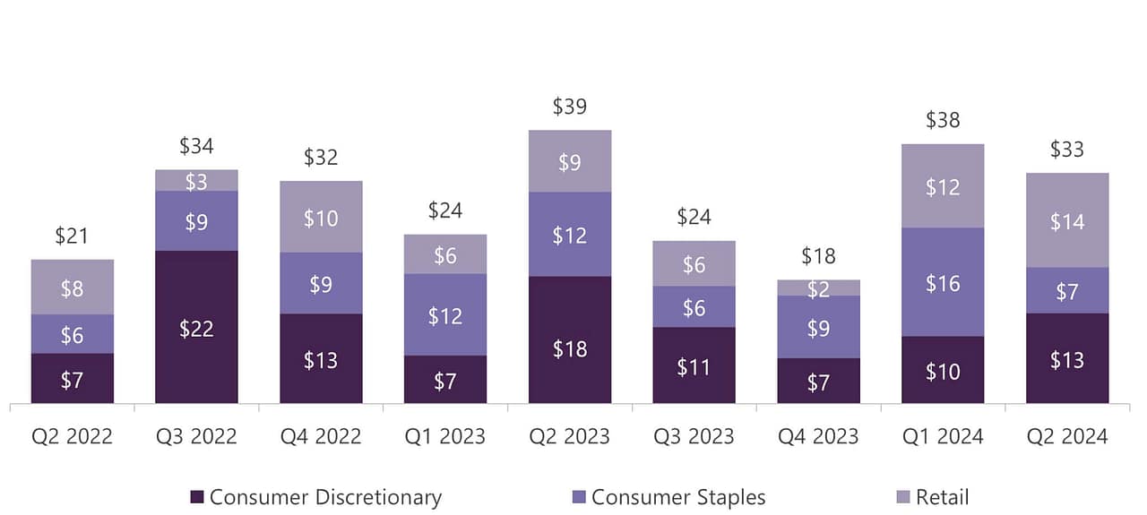 M&A activity in the consumer and retail sectors across the Americas (North America, the Caribbean, and Latin America) remained weak. It declined by 53.1% to $13.9 billion in Q2 2024, from $29.5 billion in Q1 2024. This significant downturn was driven by a notable drop in M&A activity across three segments, as dealmaking continued to struggle due to persistent macroeconomic and geopolitical challenges.