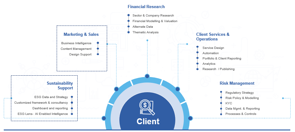 Evalueserve caters to multiple financial services clients, including investment banks, corporate and commercial banks, asset and wealth management firms, private equity and venture capital firms, and index providers. We deliver differentiated digitally-enabled insights and intelligence to various asset and wealth management teams, including strategy, product development, marketing, sales and distribution, and client servicing, enabling quick, informed, and accurate decision-making.