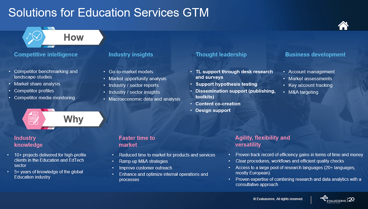 Each EdTech company may have business segments that they want to harvest. Evalueserve can offer support to identify, define, and integrate these segments within a general GTM strategy.