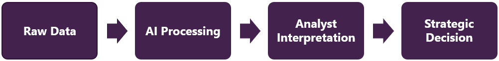 AI processes millions of documents efficiently and without fatigue, helping analysts identify broader signals more quickly.