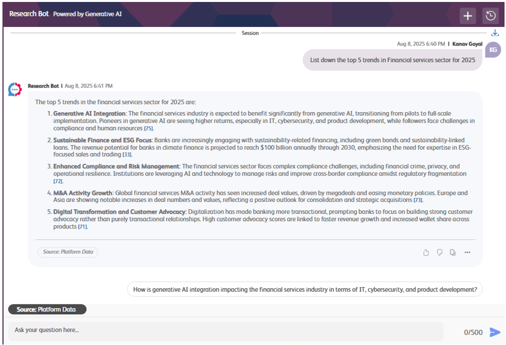 Different roles need different lenses. A market researcher might ask: "As an industry analyst, what regulatory threats should fintechs in Asia watch in 2025?" The AI responds with tailored, role-specific insights—strategic and immediately actionable.
