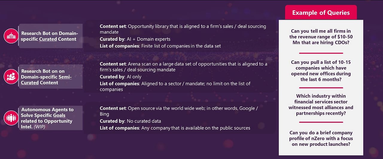 - Allowing users to find quick leads via the conversational chatbot by asking unstructured queries