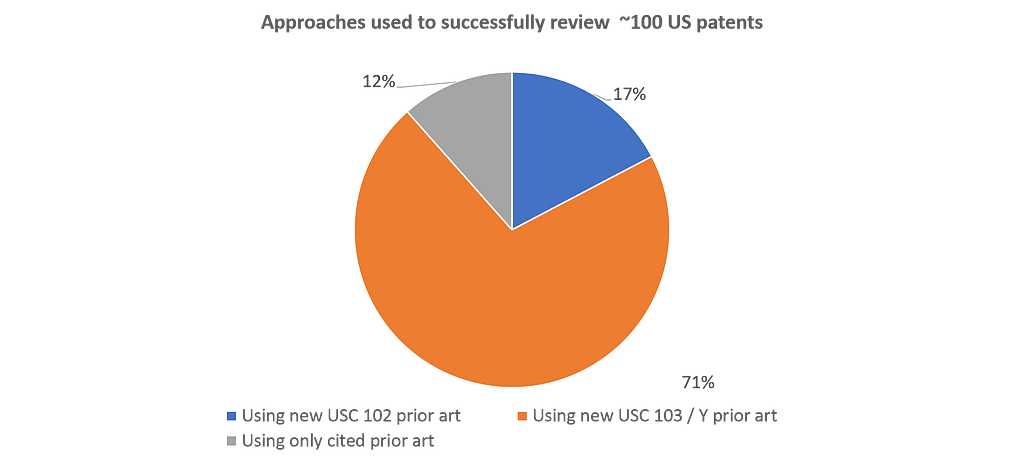 - In the remaining 12%, cited prior art documents were used to successfully review the patent without relying on any new prior art.
