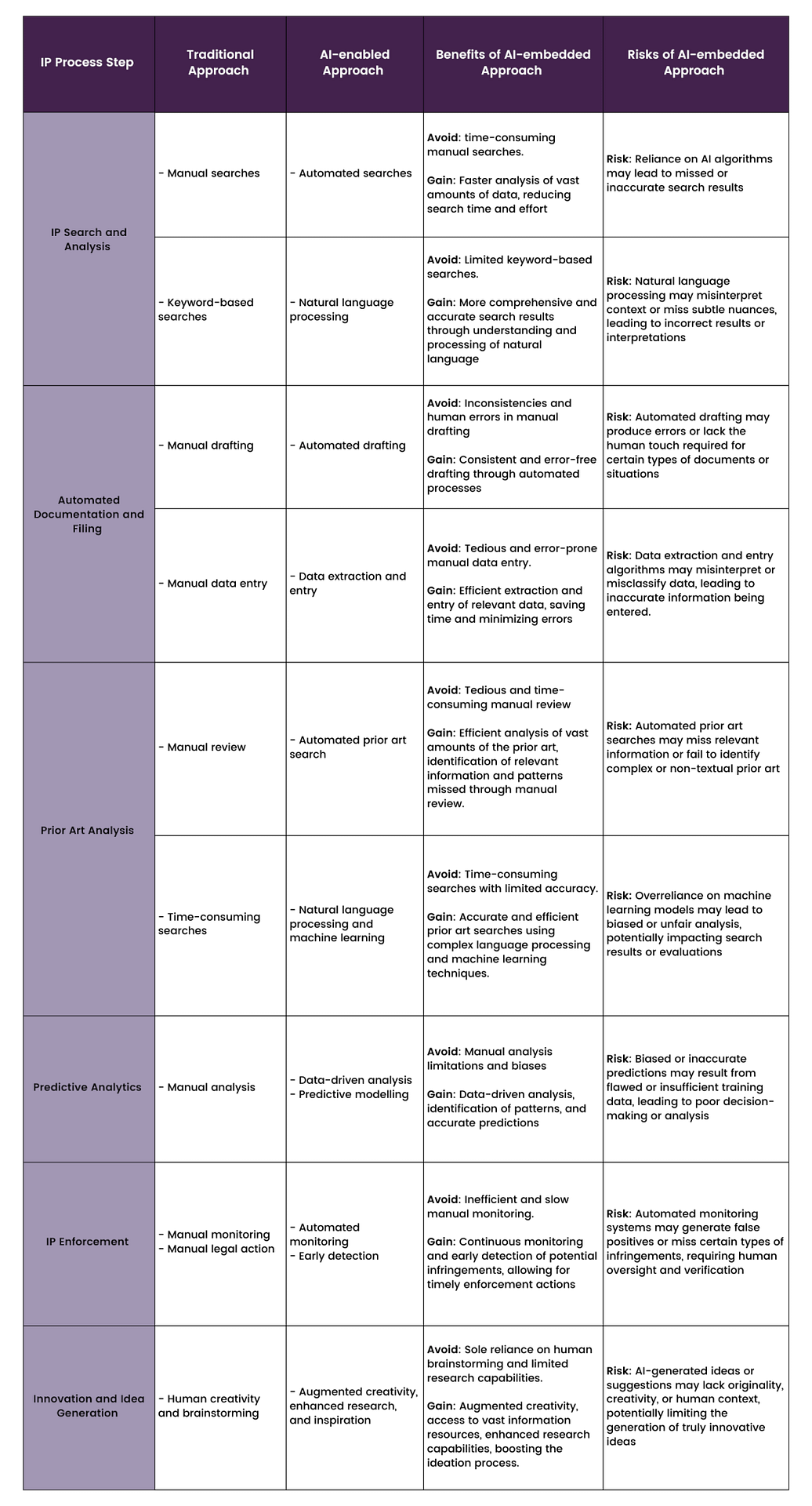 The intellectual property process involves various steps that traditionally rely on manual approaches, which can be time-consuming, prone to errors, and limited in scope. However, these processes have been transformed with artificial intelligence (AI), offering more efficient and accurate solutions. This tab will explore the benefits and risks of embedding AI in different IP process steps. The AI-enabled approach introduces automation, natural language processing, machine learning, and predictive analytics to enhance search and analysis, documentation and filing, prior art analysis, IP enforcement, innovation, and idea generation. While AI brings numerous advantages, such as faster analysis, consistent drafting, efficient data entry, and augmented creativity, risks include missed or inaccurate results, misinterpretation of context, biased research, and lack of human touch. Understanding these benefits and risks can help organisations make informed decisions about integrating AI into their IP processes.