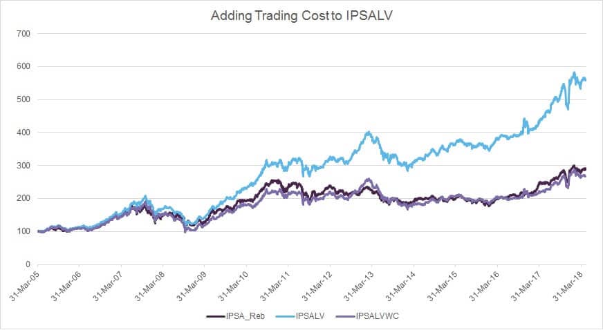 Our experiment showed that our hypothetical IPSA, Low Volatility (IPSALV), outperformed a Rebased IPSA, yielding a higher Sharpe ratio of approximately 0.52 (between 2005 and 2018). This affirmation generated interest and discussion on the possibility of replicating the strategy. Therefore, we decided to simulate an investable index by including trading cost, i.e., the cost associated with buying and selling stocks during the rebalancing period.