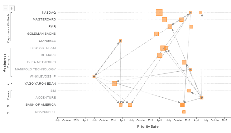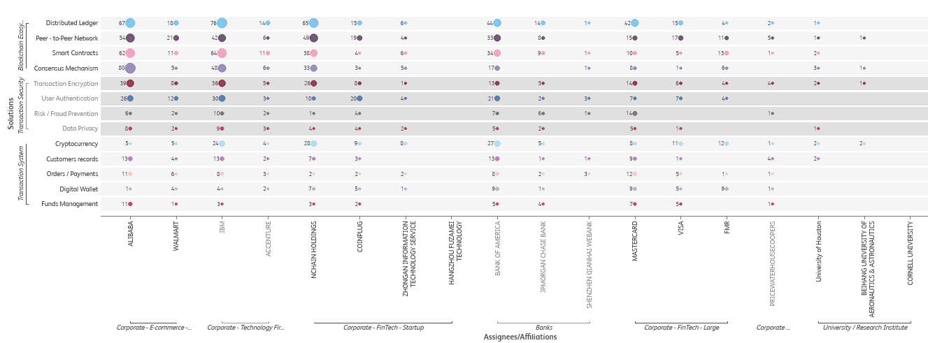With this information, business and product managers now can use the charts to differentiate solution areas by company, making it easy to tell which company prefers to focus on a particular solution area or application. This also makes it possible to tell the lines of business of a technology player by looking at their patent portfolio. Taking again the Blockchain example, a company may focus purely on Healthcare technology applications, or all of its solutions may be pertinent to Transaction security for Financial applications.