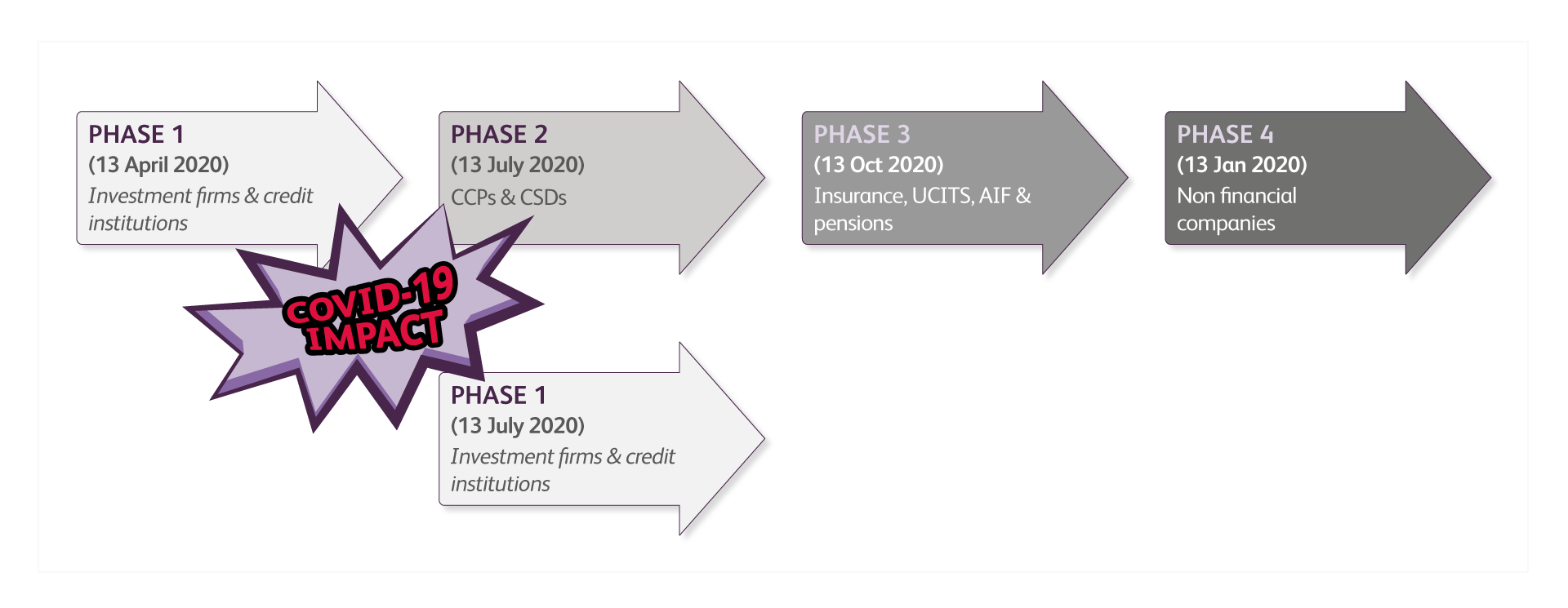 Phase 1 and phase 2 (13th July): The first wave of financial counterparties (FCs) were comprised of investment firms and credit institutions. After Covid-19, various credit institutions were integrated into this phase as well. The main CCPs covered were central counterparties clearing houses, CSDs central securities depositories, etc.