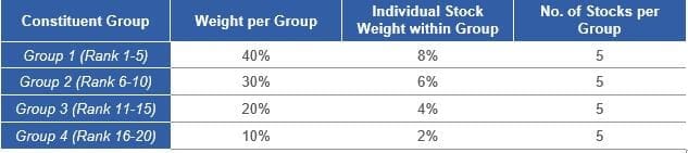 - If the maximum cap of 20 stocks meets the selection criteria, the constituent weights are based on the ESG ranking as follows: