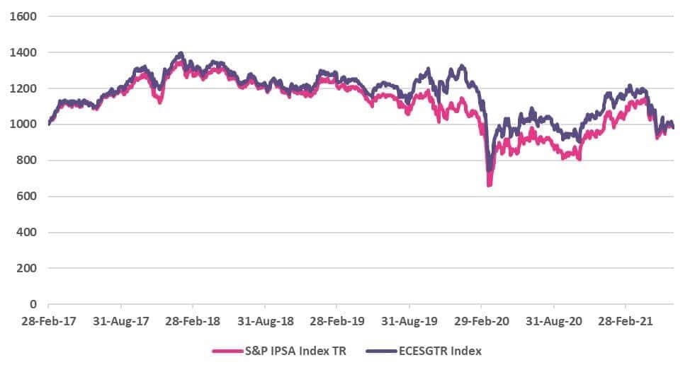 EVCHESGTR Index is a total return index designed to track the performance of Chilean companies that have a better ESG exposure relative to the broader market. Its index universe consists of constituents of the benchmark S&P IPSA (SPIPSATR) Index, which tracks the 30 largest and most liquid stocks listed on the Santiago Stock Exchange. For the index construction, we adopt a positive screening approach. The selected companies are “best in class” based on ESG metrics (as defined by an ESG score threshold). This approach results in a portfolio with better ESG features and is widely accepted in ESG investing strategies.