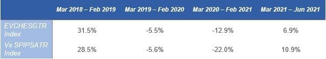 Figure 1: EVCHESGTR Index vs. SPIPSATR Index (28 Feb 2017 – 30 Jun 2021)