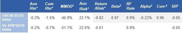 3 Alpha: A measure of performance on a risk-adjusted basis. The excess return relative to SPIPSATR. 4 Correlation (Corr): A statistical measure of how SPIPSATR and EVCHESGTR move in relation to each other, which is calculated based on monthly returns. 5 Sharpe Ratio (SR): A measure of risk-adjusted performance. *Ann Rt: Annualized Return; Cum Rtn: Cumulative Return; Ann Risk: Annualized Volatility: Return/Risk: Annualized Return adjusted by Annualized Volatility.