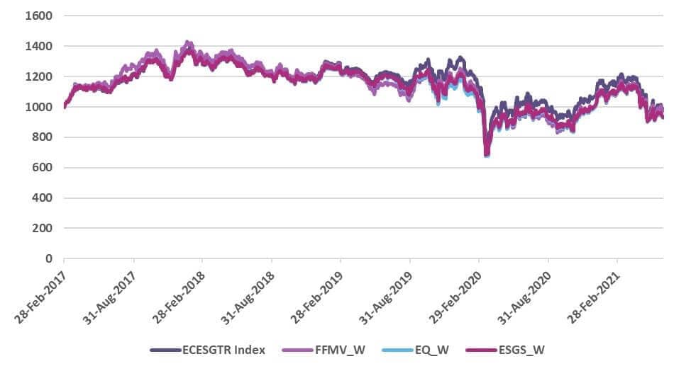 During the period of analysis, we find that EVCHESGTR Index outperformed the equal weighted (EQ_W) and ESG score weighted (ESGS_W) indexes. The performance of the free float Mcap weighted (FFMV_W) index was comparable to that of EVCHESGTR Index.